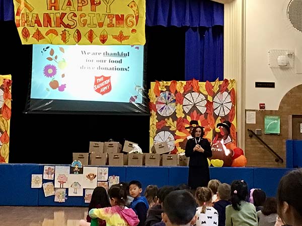 Finally, some members of the Salvation Army came and talked to us about how thankful they were for our food donations to the poor. Each grade donated something different such as canned corn and mashed potatoes, so families in need could celebrate Thanksgiving like us.